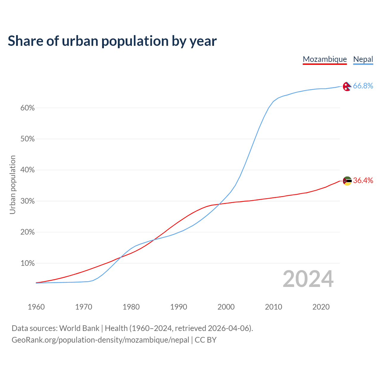 From 2004 to 2024, the share of urban population changed from 29.9% to 36.4% in Mozambique and from 41.6% to 66.8% in Nepal.
