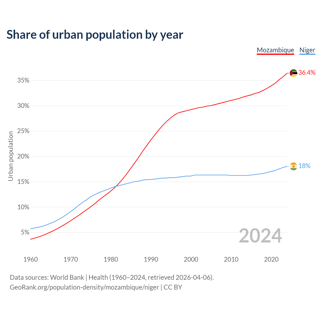 From 2004 to 2024, the share of urban population changed from 29.9% to 36.4% in Mozambique and from 16.3% to 18% in Niger.