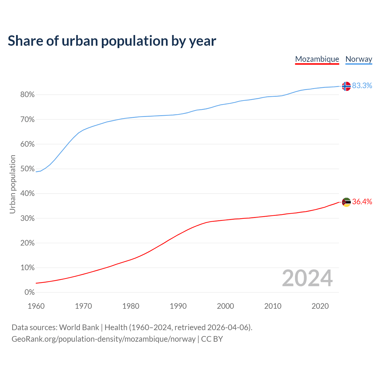 From 2004 to 2024, the share of urban population changed from 29.9% to 36.4% in Mozambique and from 77.6% to 83.3% in Norway.