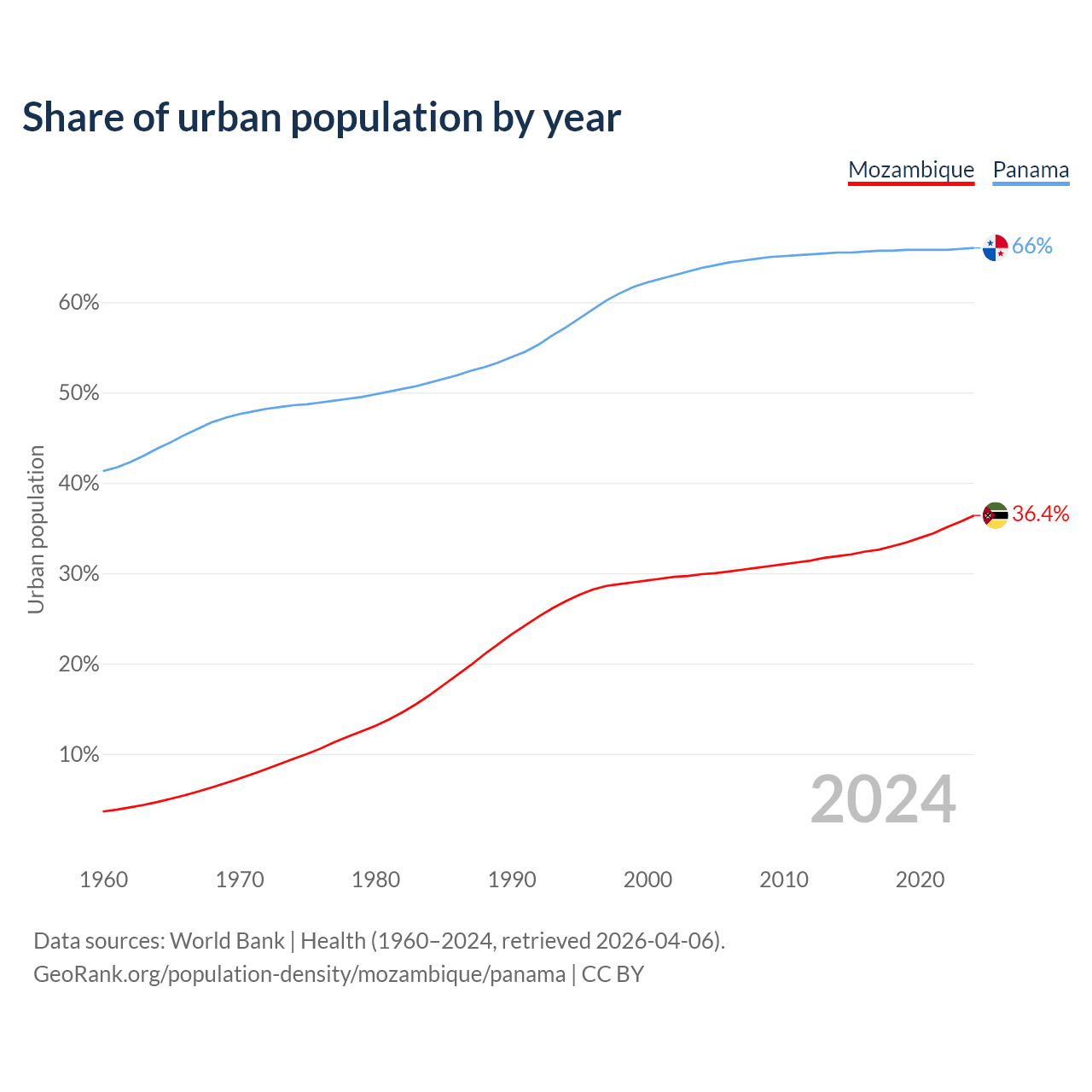 From 2004 to 2024, the share of urban population changed from 29.9% to 36.4% in Mozambique and from 63.8% to 66% in Panama.