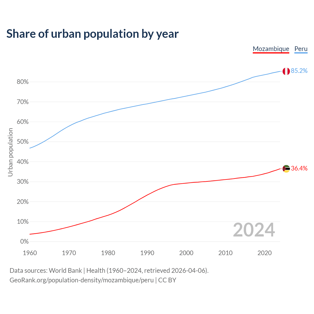 From 2004 to 2024, the share of urban population changed from 29.9% to 36.4% in Mozambique and from 74.4% to 85.2% in Peru.