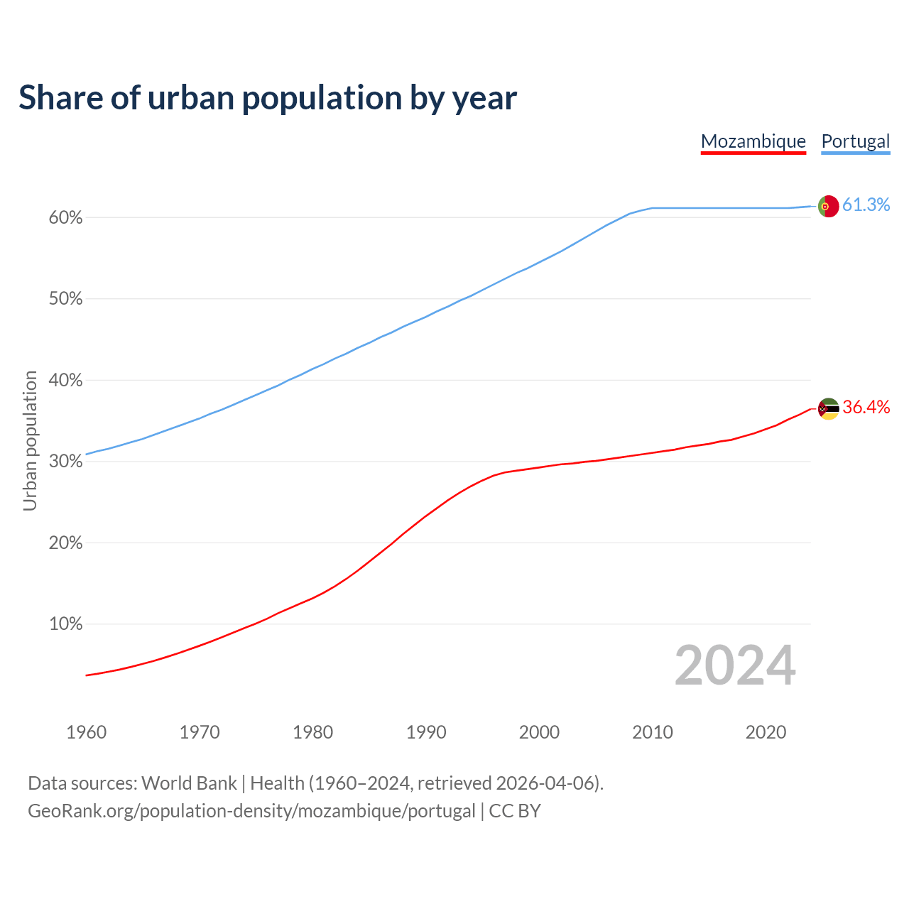 From 2004 to 2024, the share of urban population changed from 29.9% to 36.4% in Mozambique and from 57.4% to 61.3% in Portugal.