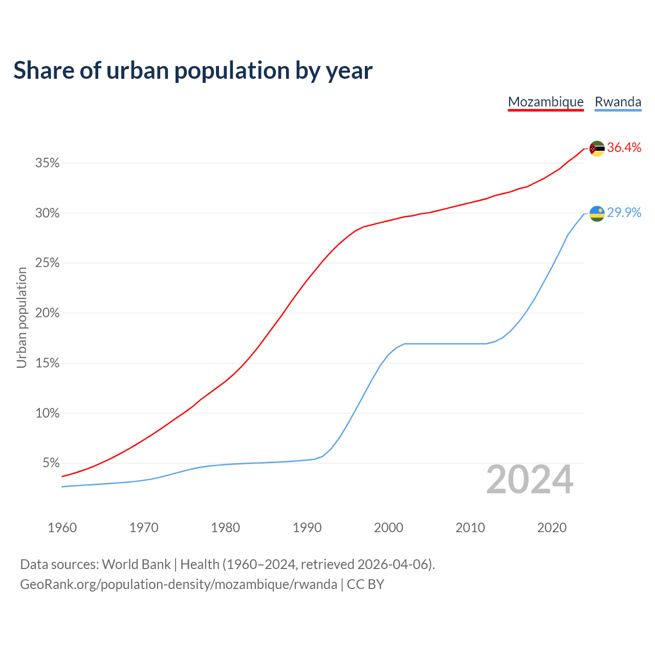 From 2004 to 2024, the share of urban population changed from 29.9% to 36.4% in Mozambique and from 16.9% to 29.9% in Rwanda.