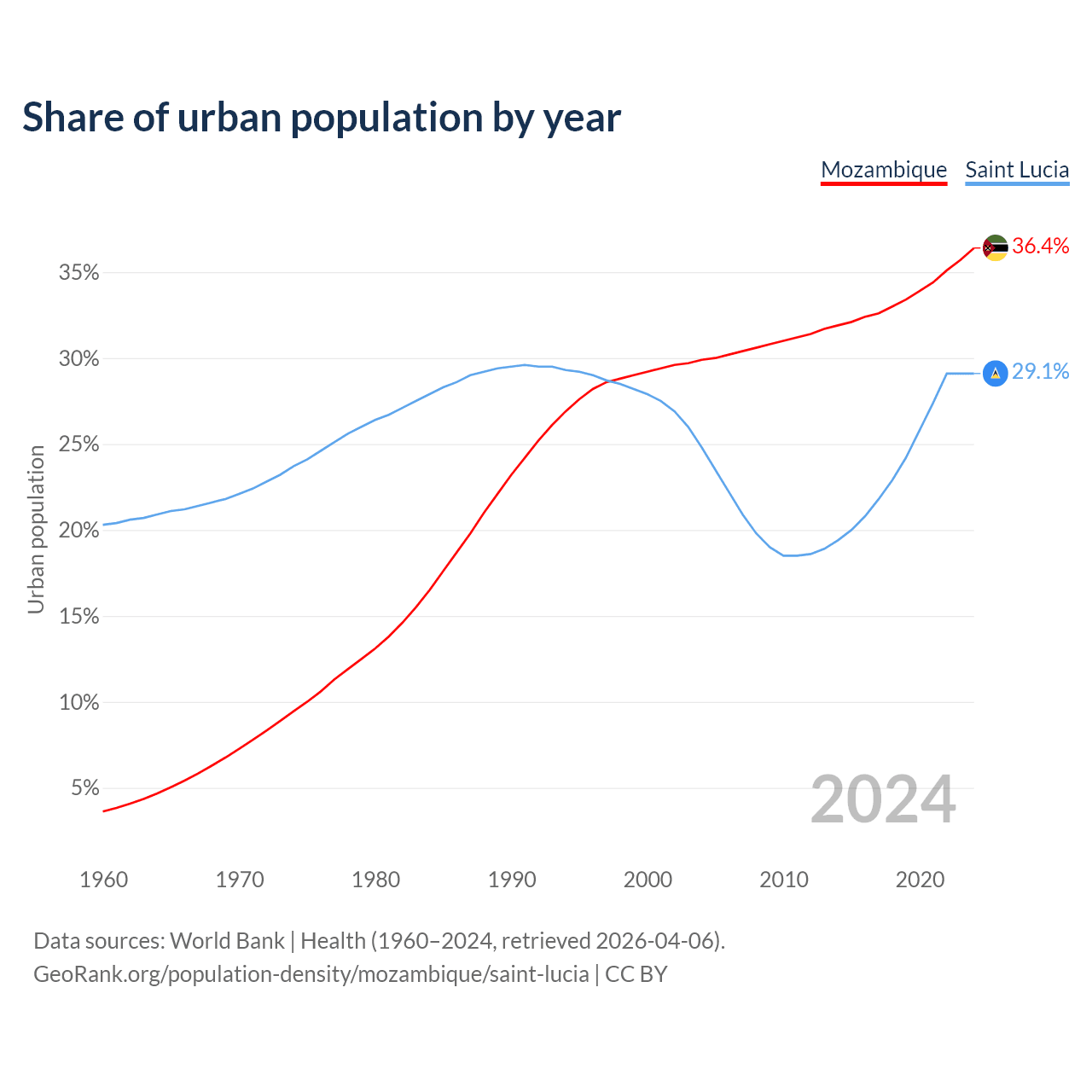 From 2004 to 2024, the share of urban population changed from 29.9% to 36.4% in Mozambique and from 24.8% to 29.1% in Saint Lucia.