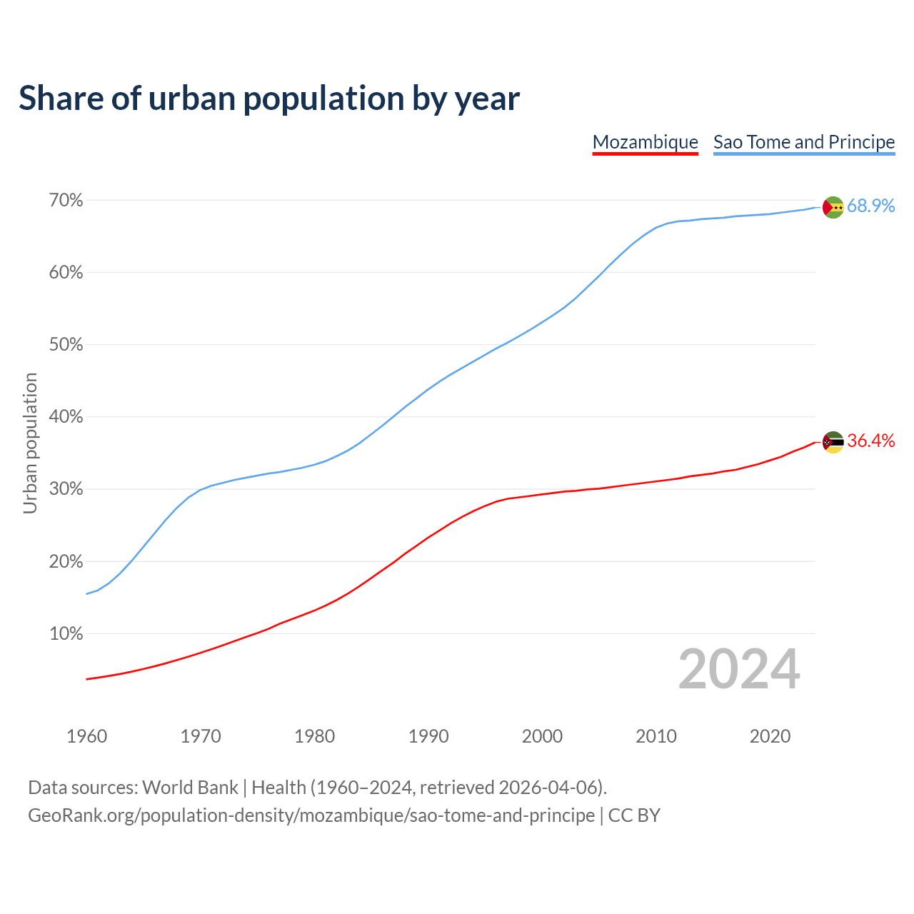 From 2004 to 2024, the share of urban population changed from 29.9% to 36.4% in Mozambique and from 57.9% to 68.9% in Sao Tome and Principe.