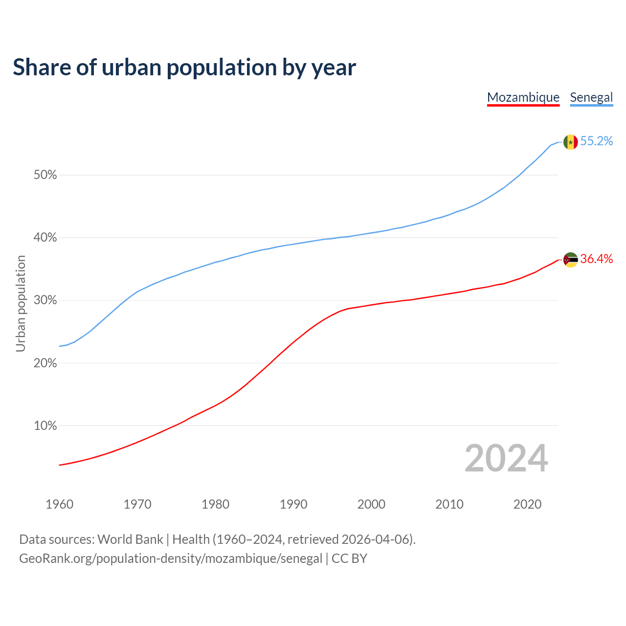 From 2004 to 2024, the share of urban population changed from 29.9% to 36.4% in Mozambique and from 41.6% to 55.2% in Senegal.