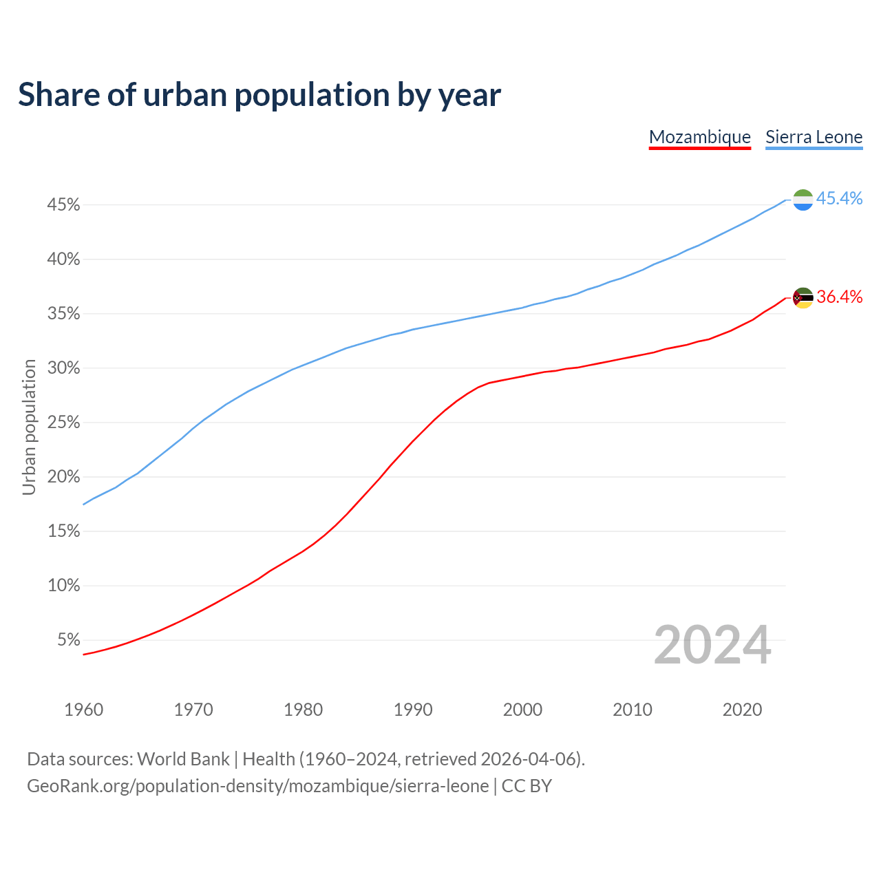 From 2004 to 2024, the share of urban population changed from 29.9% to 36.4% in Mozambique and from 36.5% to 45.4% in Sierra Leone.
