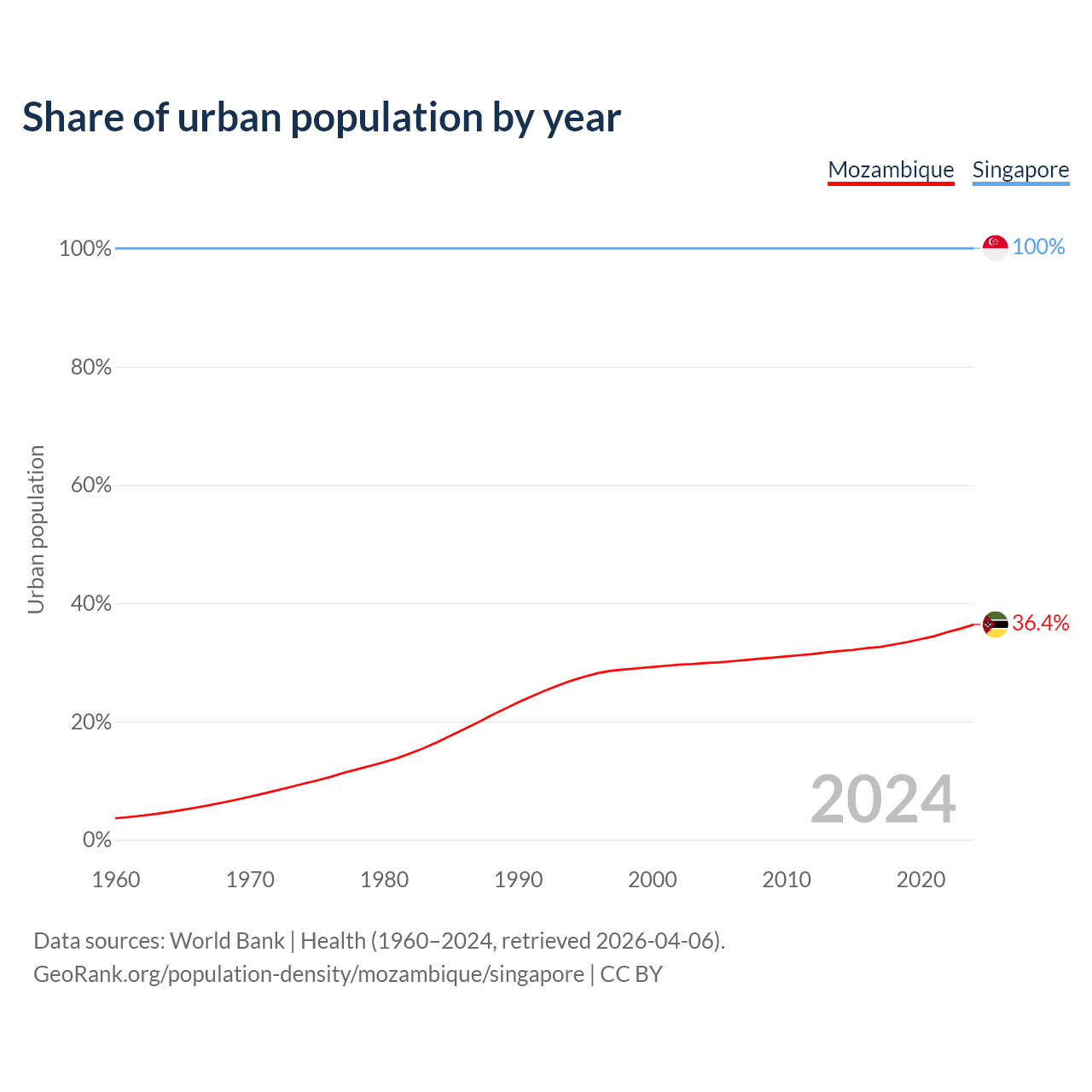 From 2004 to 2024, the share of urban population changed from 29.9% to 36.4% in Mozambique and from 100% to 100% in Singapore.