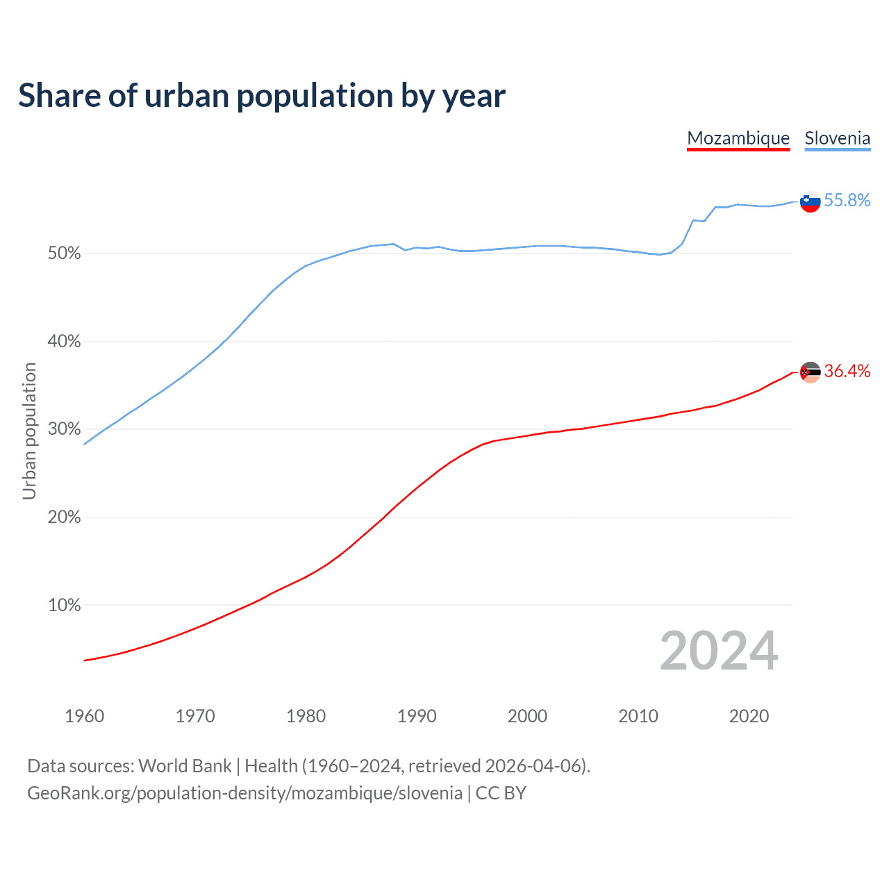 From 2004 to 2024, the share of urban population changed from 29.9% to 36.4% in Mozambique and from 50.7% to 55.8% in Slovenia.