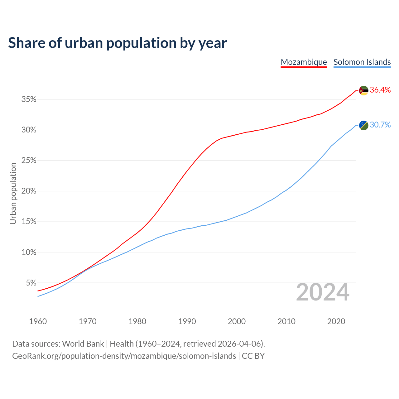 From 2004 to 2024, the share of urban population changed from 29.9% to 36.4% in Mozambique and from 17.2% to 30.7% in the Solomon Islands.