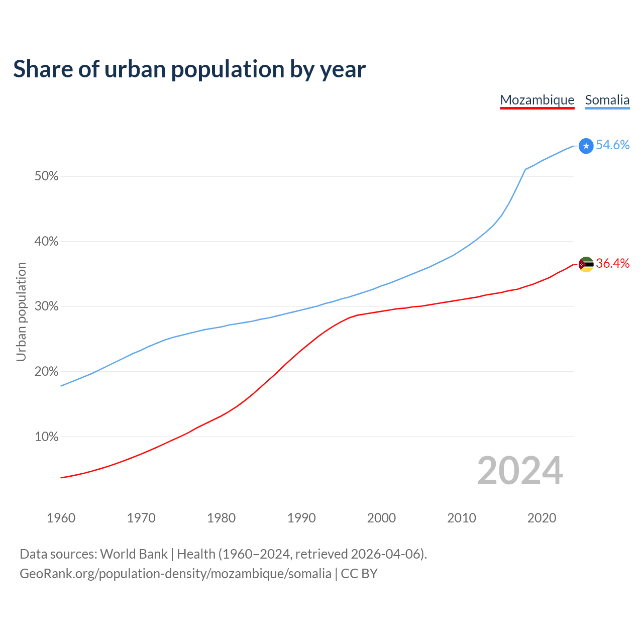 From 2004 to 2024, the share of urban population changed from 29.9% to 36.4% in Mozambique and from 35% to 54.6% in Somalia.