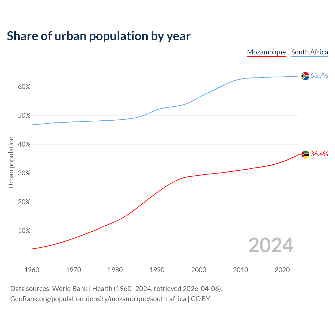 From 2004 to 2024, the share of urban population changed from 29.9% to 36.4% in Mozambique and from 59.1% to 63.7% in South Africa.