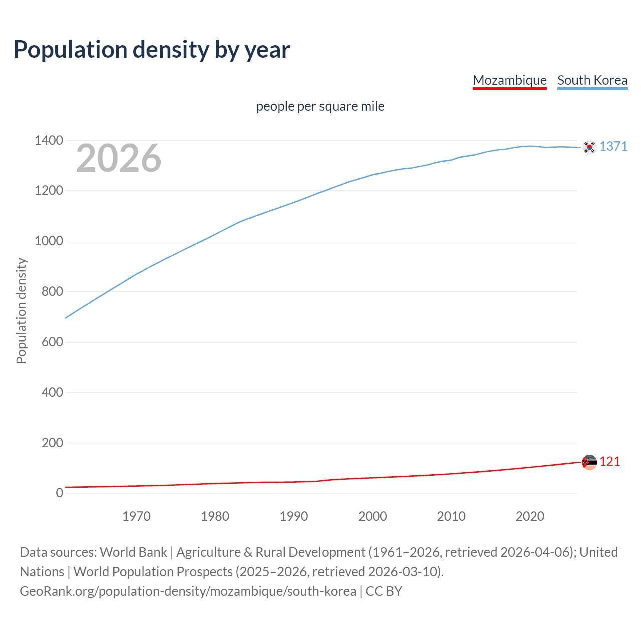 From 2006 to 2026, population density in Mozambique increased by 76.4%, compared to a 5.84% growth in South Korea.