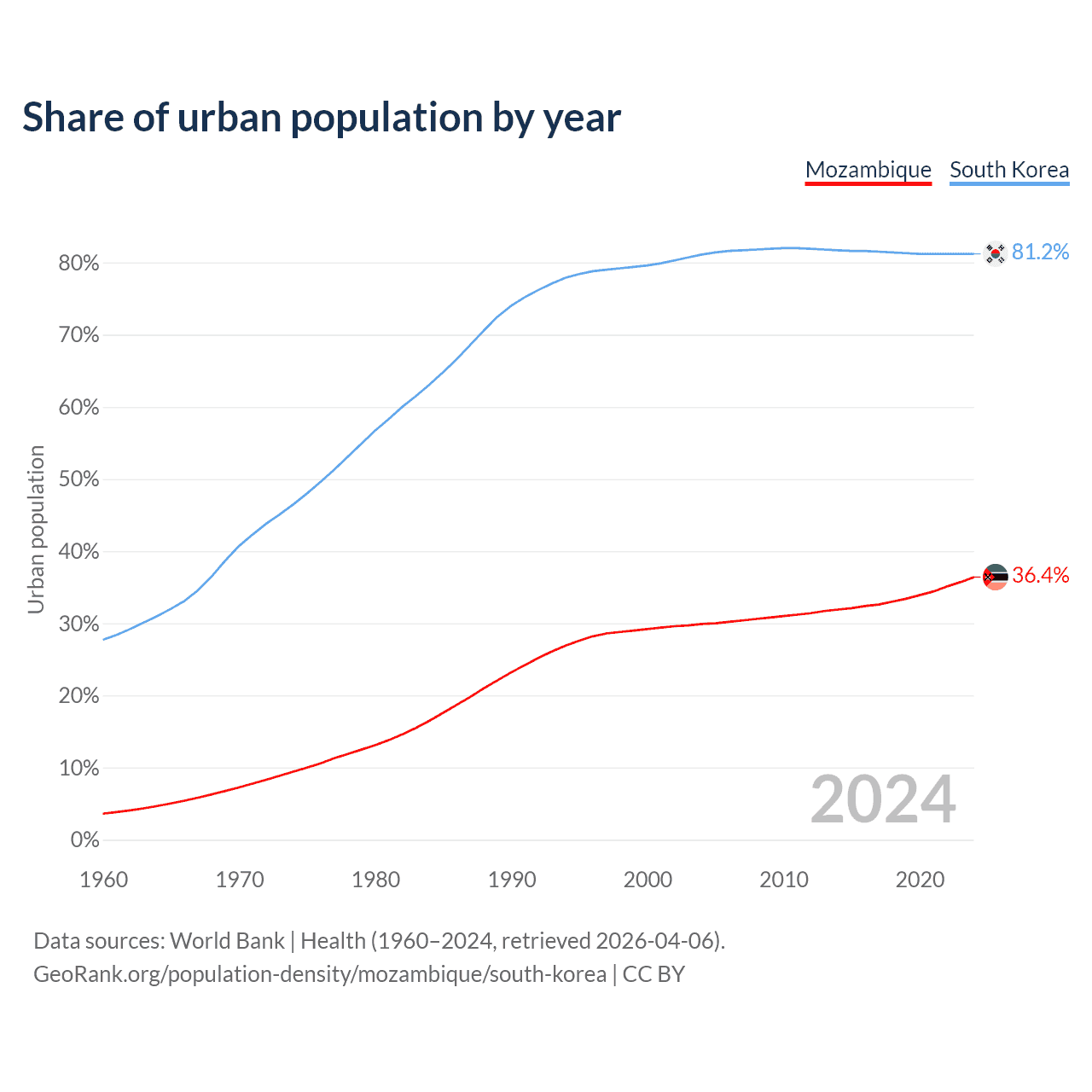 From 2004 to 2024, the share of urban population changed from 29.9% to 36.4% in Mozambique and from 81.1% to 81.2% in South Korea.