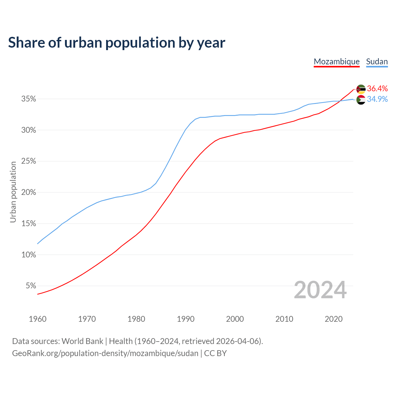 From 2004 to 2024, the share of urban population changed from 29.9% to 36.4% in Mozambique and from 32.4% to 34.9% in Sudan.