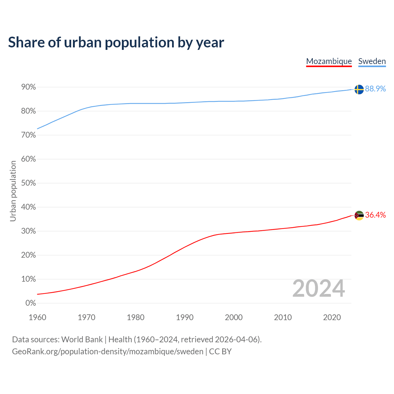 From 2004 to 2024, the share of urban population changed from 29.9% to 36.4% in Mozambique and from 84.3% to 88.9% in Sweden.