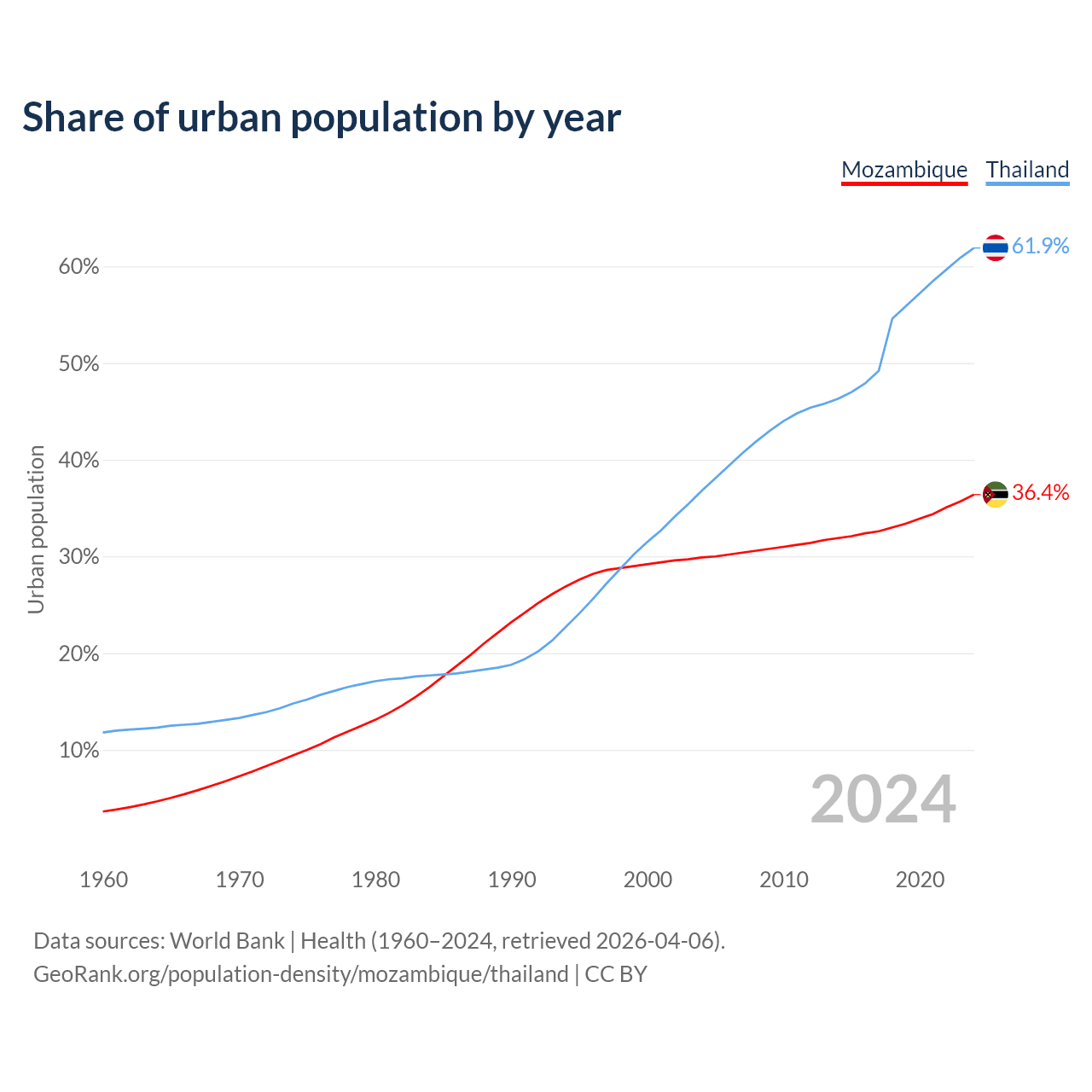From 2004 to 2024, the share of urban population changed from 29.9% to 36.4% in Mozambique and from 36.8% to 61.9% in Thailand.