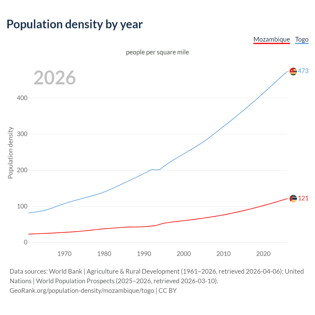 From 2006 to 2026, population density in Mozambique increased by 76.4%, compared to a 65.2% growth in Togo.