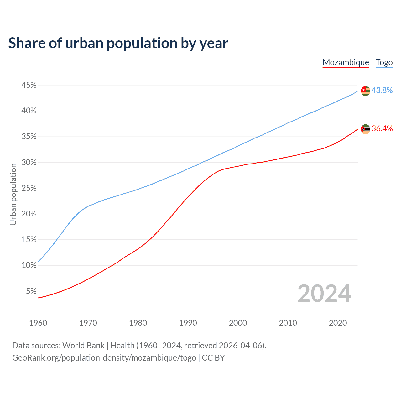 From 2004 to 2024, the share of urban population changed from 29.9% to 36.4% in Mozambique and from 34.9% to 43.8% in Togo.