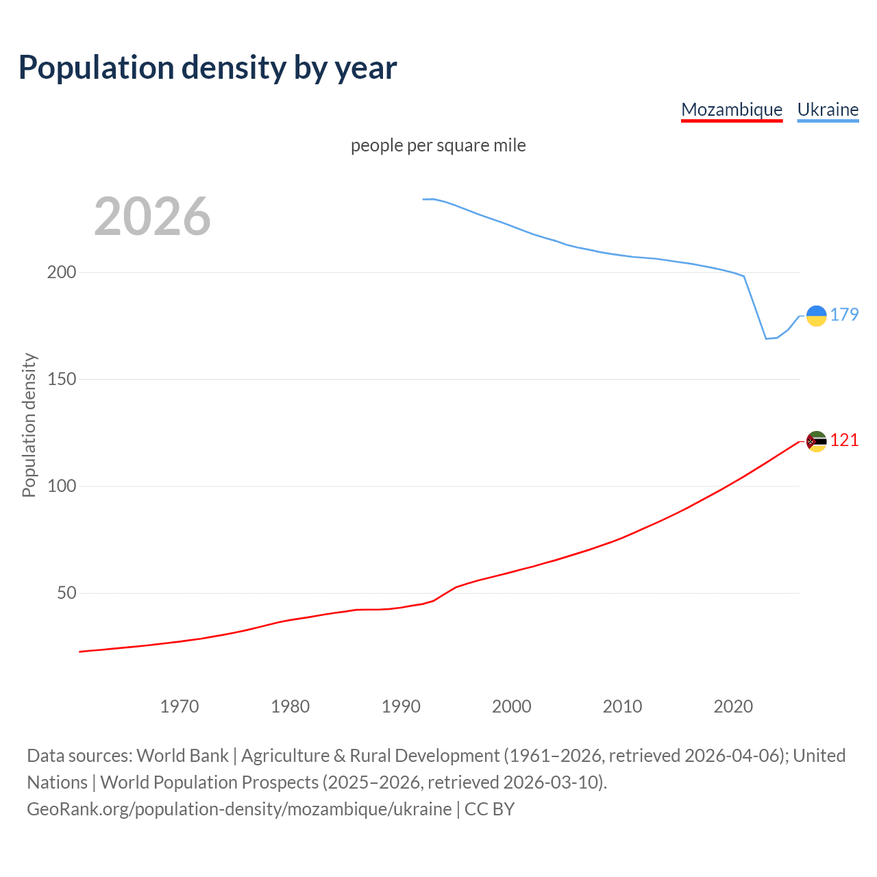 From 2006 to 2026, population density in Mozambique increased by 76.4%, compared to a 15.1% decline in Ukraine.