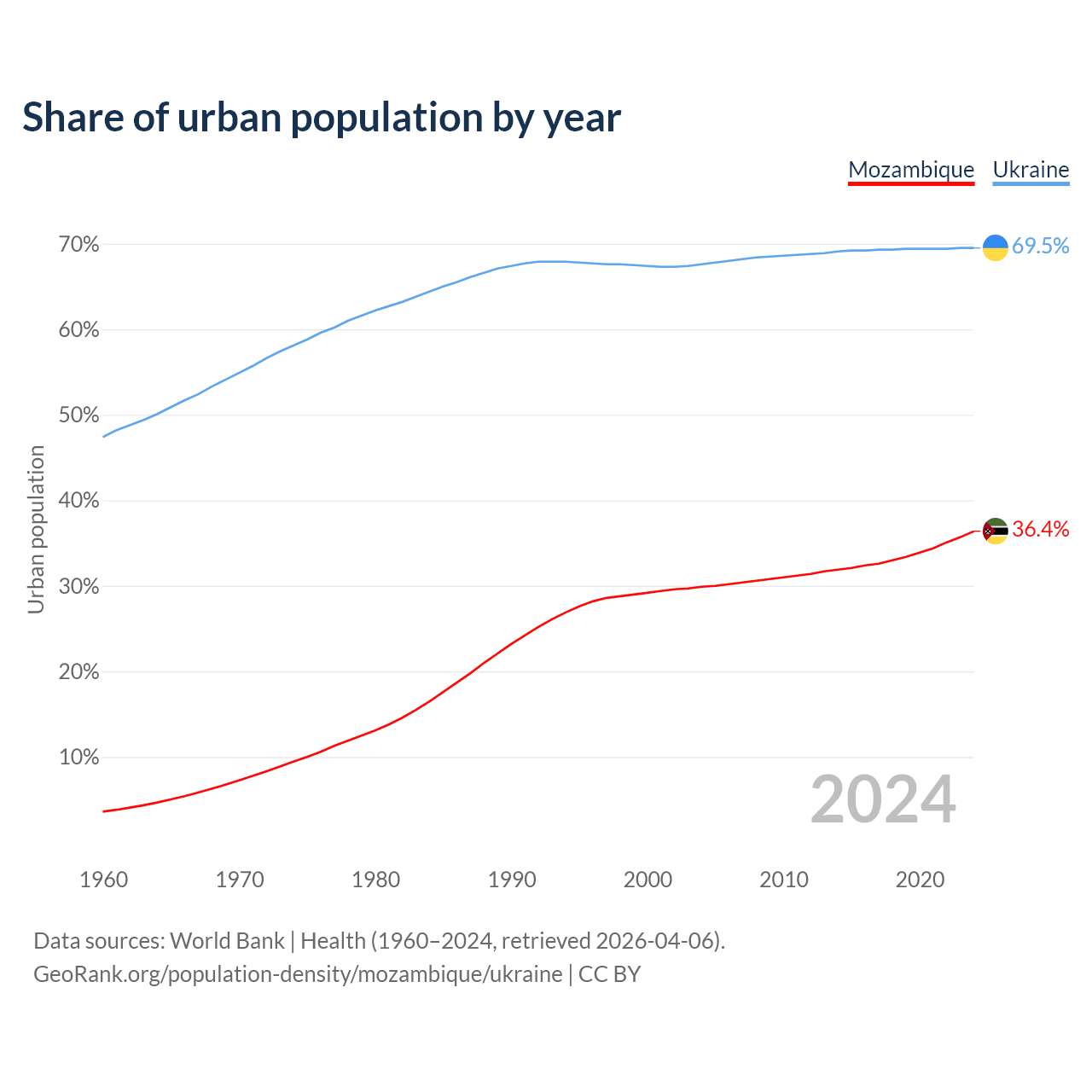 From 2004 to 2024, the share of urban population changed from 29.9% to 36.4% in Mozambique and from 67.6% to 69.5% in Ukraine.