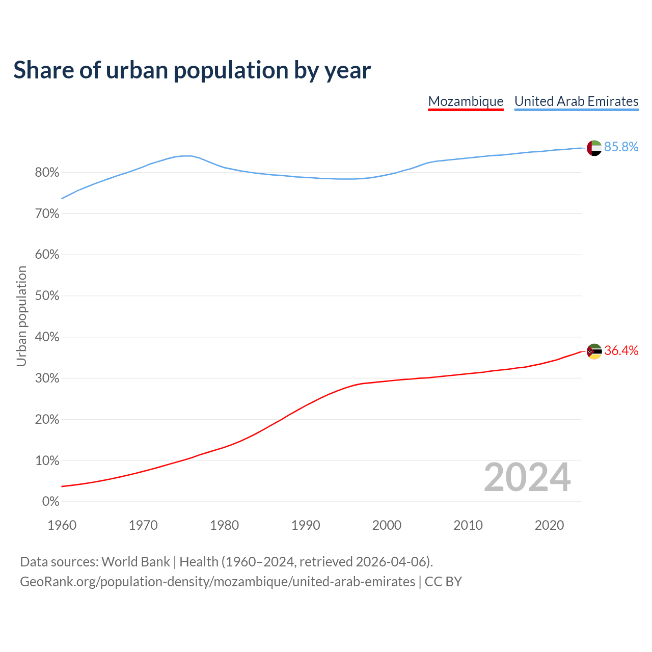 From 2004 to 2024, the share of urban population changed from 29.9% to 36.4% in Mozambique and from 81.5% to 85.8% in the United Arab Emirates.