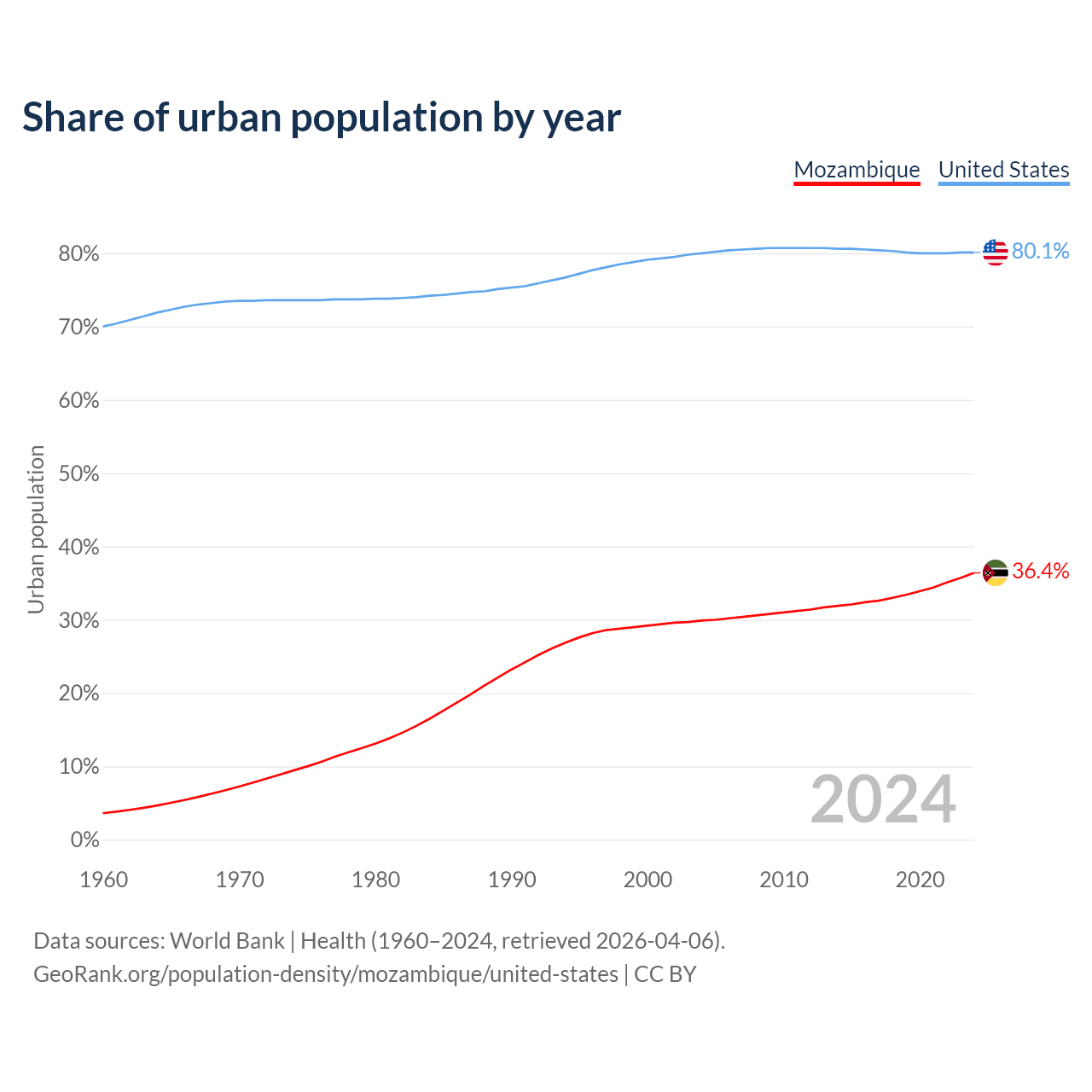 From 2004 to 2024, the share of urban population changed from 29.9% to 36.4% in Mozambique and from 80% to 80.1% in the United States.