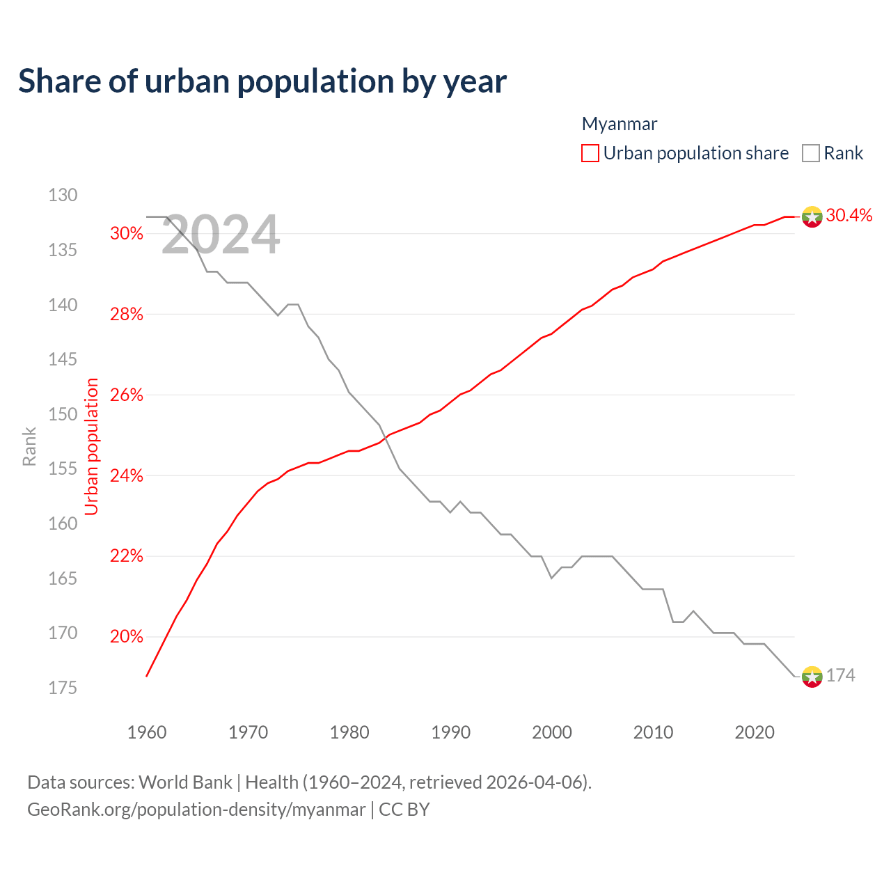 This chart shows the share of urban population in Myanmar from 1960 to 2024: 19% lived in urban areas in 1960, 27.5% in 2000, and 30.4% in 2024.