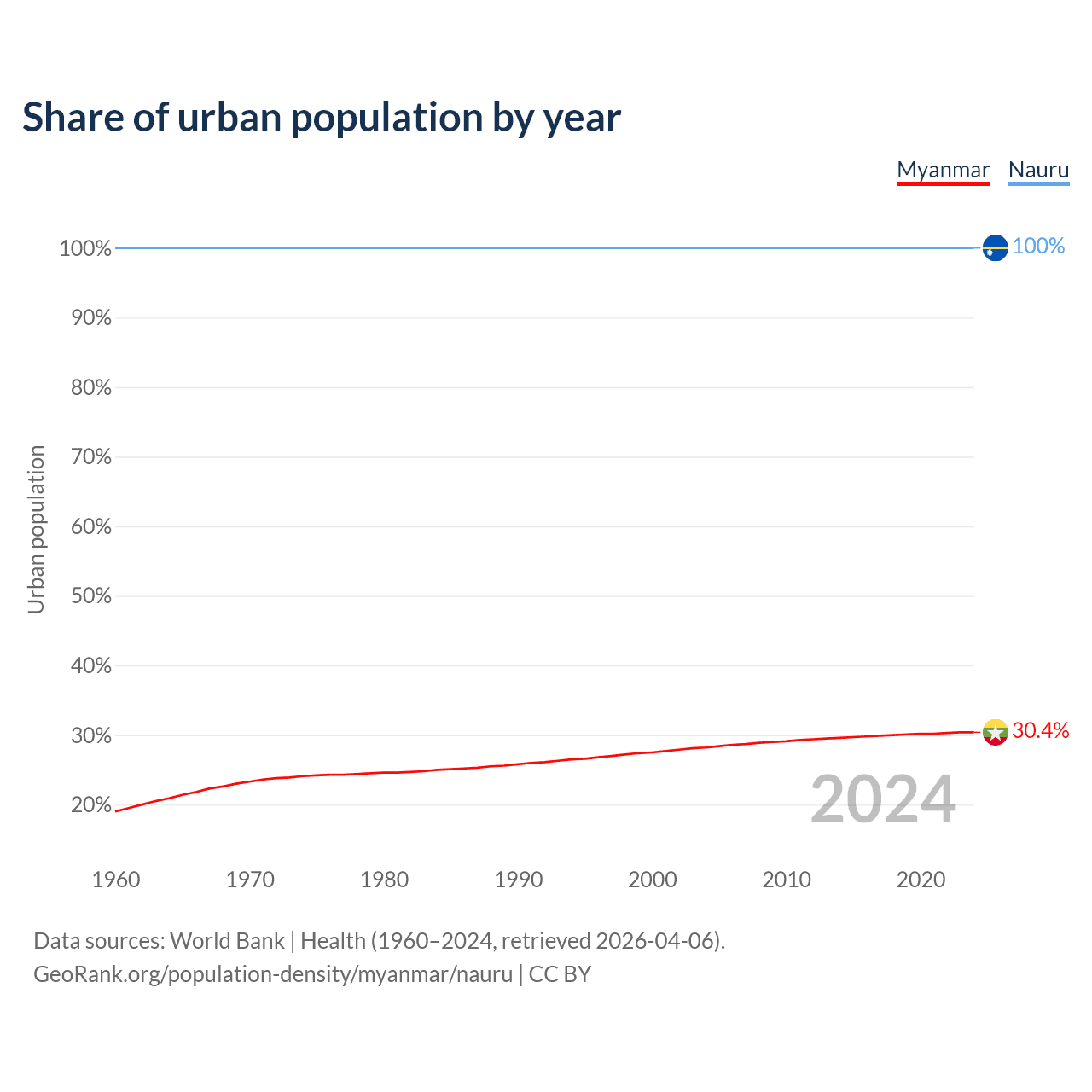 From 2004 to 2024, the share of urban population changed from 28.2% to 30.4% in Myanmar and from 100% to 100% in Nauru.