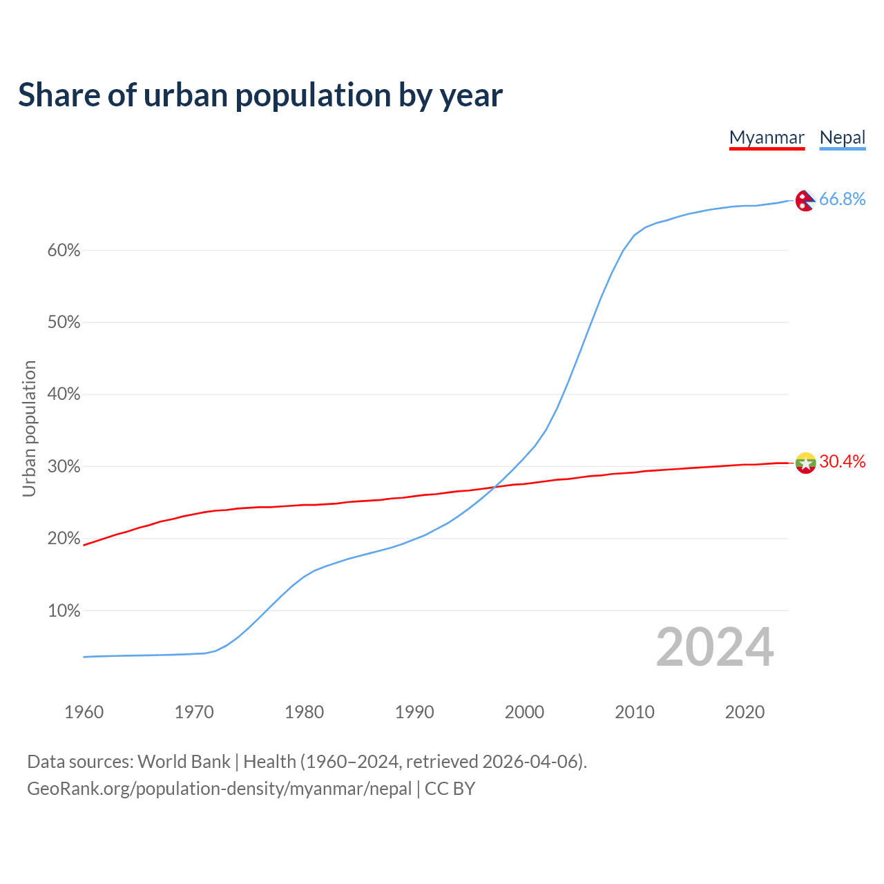 From 2004 to 2024, the share of urban population changed from 28.2% to 30.4% in Myanmar and from 41.6% to 66.8% in Nepal.