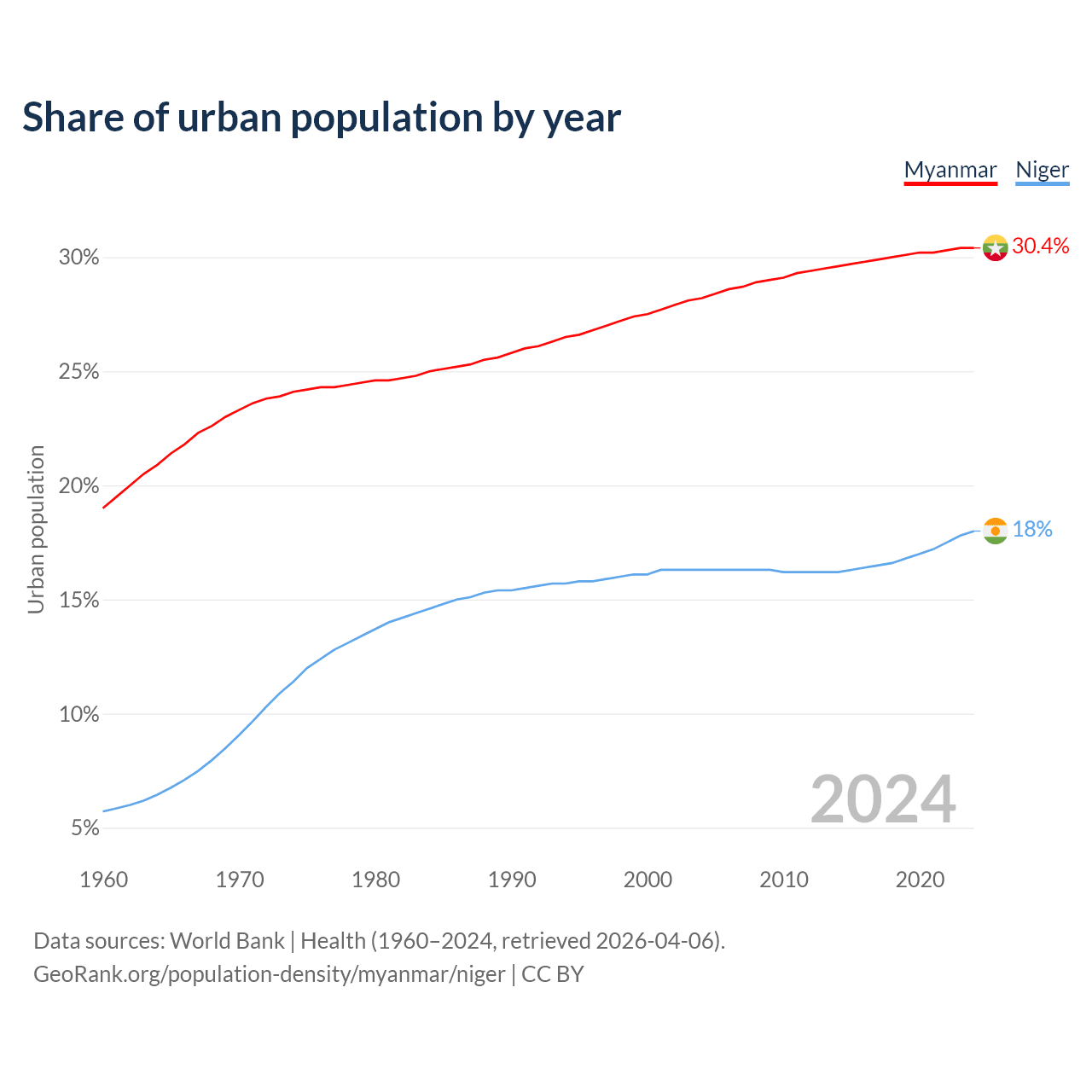 From 2004 to 2024, the share of urban population changed from 28.2% to 30.4% in Myanmar and from 16.3% to 18% in Niger.
