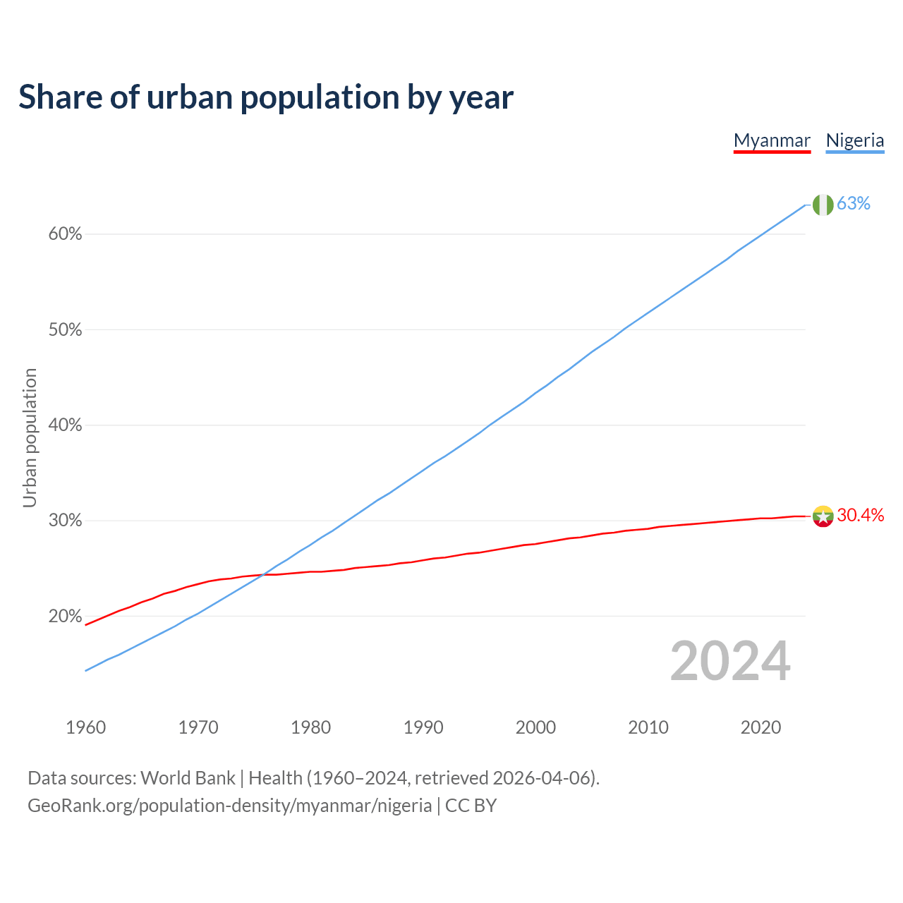 From 2004 to 2024, the share of urban population changed from 28.2% to 30.4% in Myanmar and from 46.7% to 63% in Nigeria.
