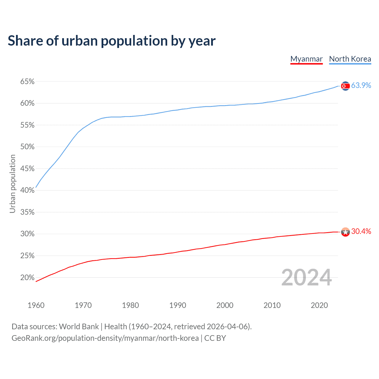 From 2004 to 2024, the share of urban population changed from 28.2% to 30.4% in Myanmar and from 59.7% to 63.9% in North Korea.