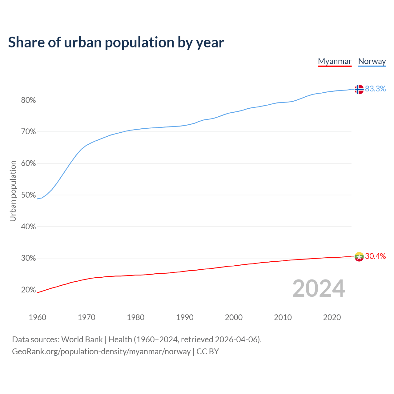 From 2004 to 2024, the share of urban population changed from 28.2% to 30.4% in Myanmar and from 77.6% to 83.3% in Norway.