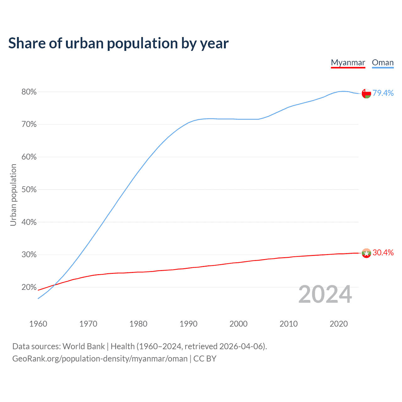 From 2004 to 2024, the share of urban population changed from 28.2% to 30.4% in Myanmar and from 71.5% to 79.4% in Oman.