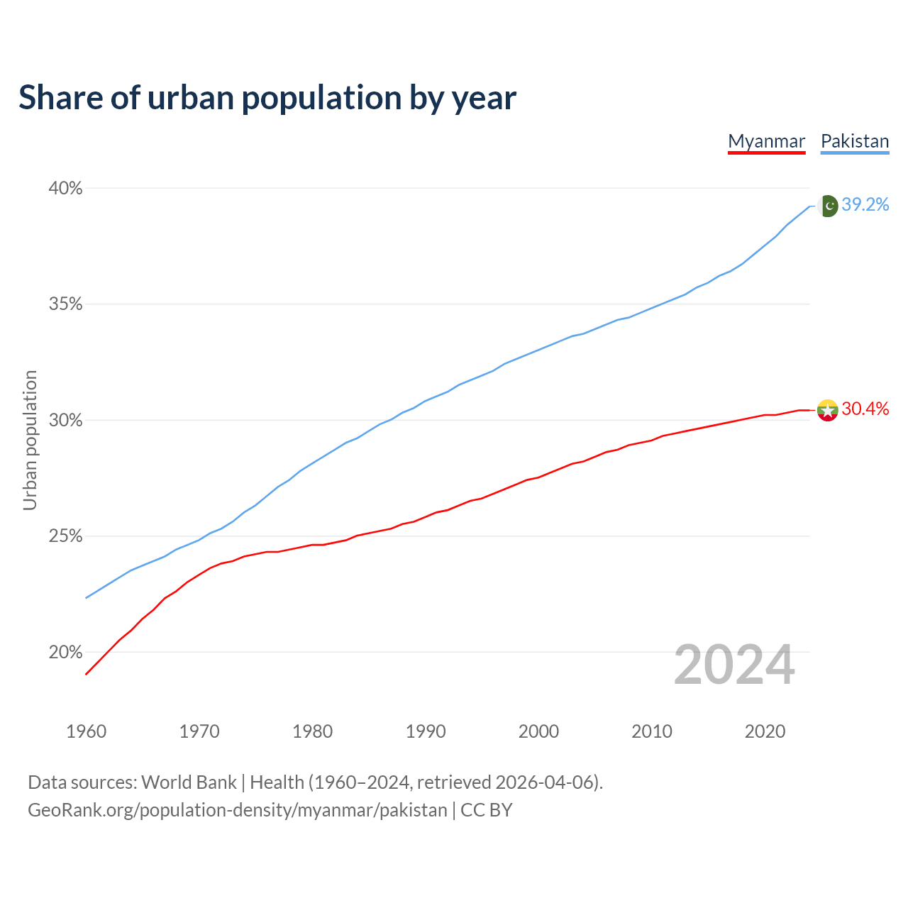 From 2004 to 2024, the share of urban population changed from 28.2% to 30.4% in Myanmar and from 33.7% to 39.2% in Pakistan.
