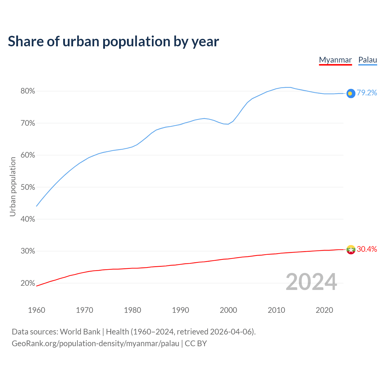 From 2004 to 2024, the share of urban population changed from 28.2% to 30.4% in Myanmar and from 76.4% to 79.2% in Palau.