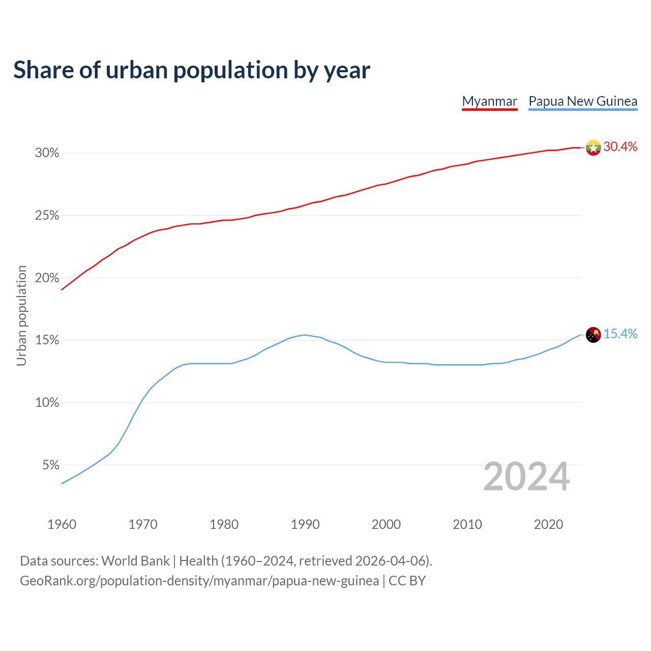 From 2004 to 2024, the share of urban population changed from 28.2% to 30.4% in Myanmar and from 13.1% to 15.4% in Papua New Guinea.