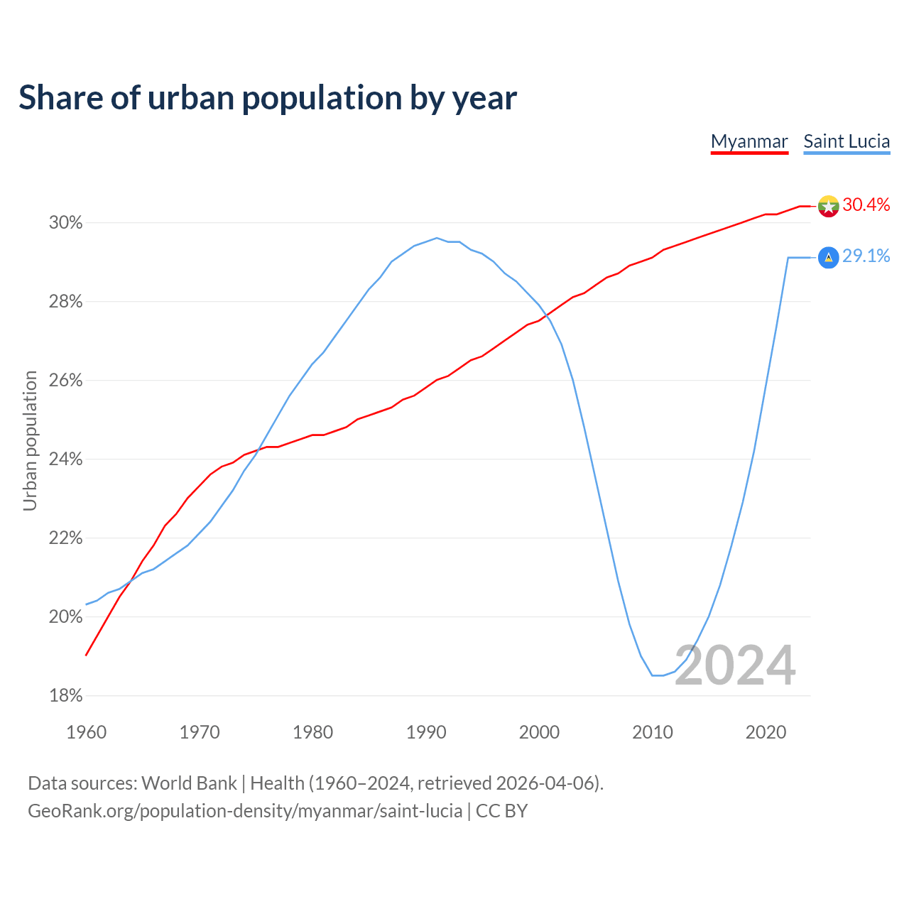 From 2004 to 2024, the share of urban population changed from 28.2% to 30.4% in Myanmar and from 24.8% to 29.1% in Saint Lucia.