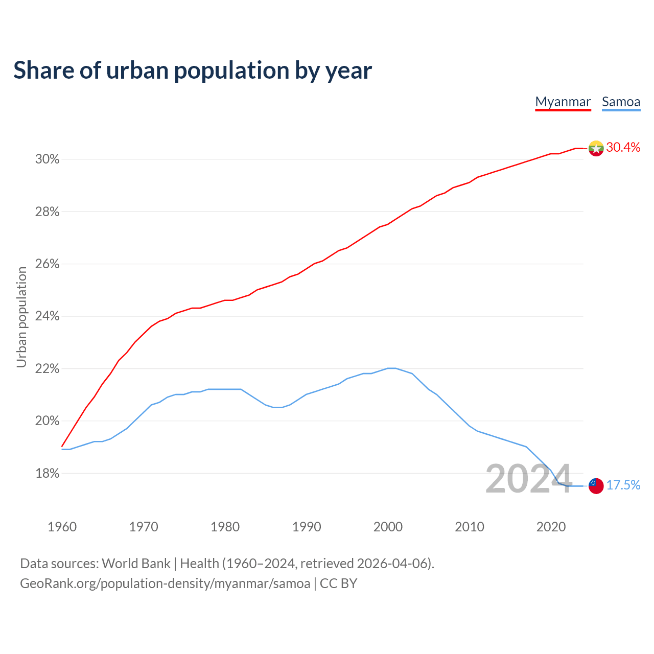 From 2004 to 2024, the share of urban population changed from 28.2% to 30.4% in Myanmar and from 21.5% to 17.5% in Samoa.