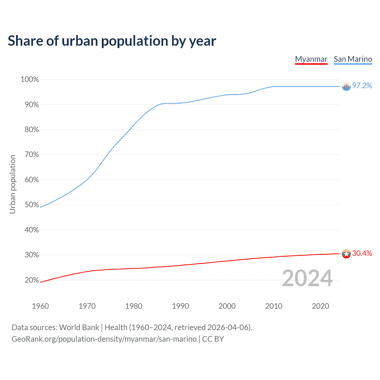 From 2004 to 2024, the share of urban population changed from 28.2% to 30.4% in Myanmar and from 94.2% to 97.2% in San Marino.