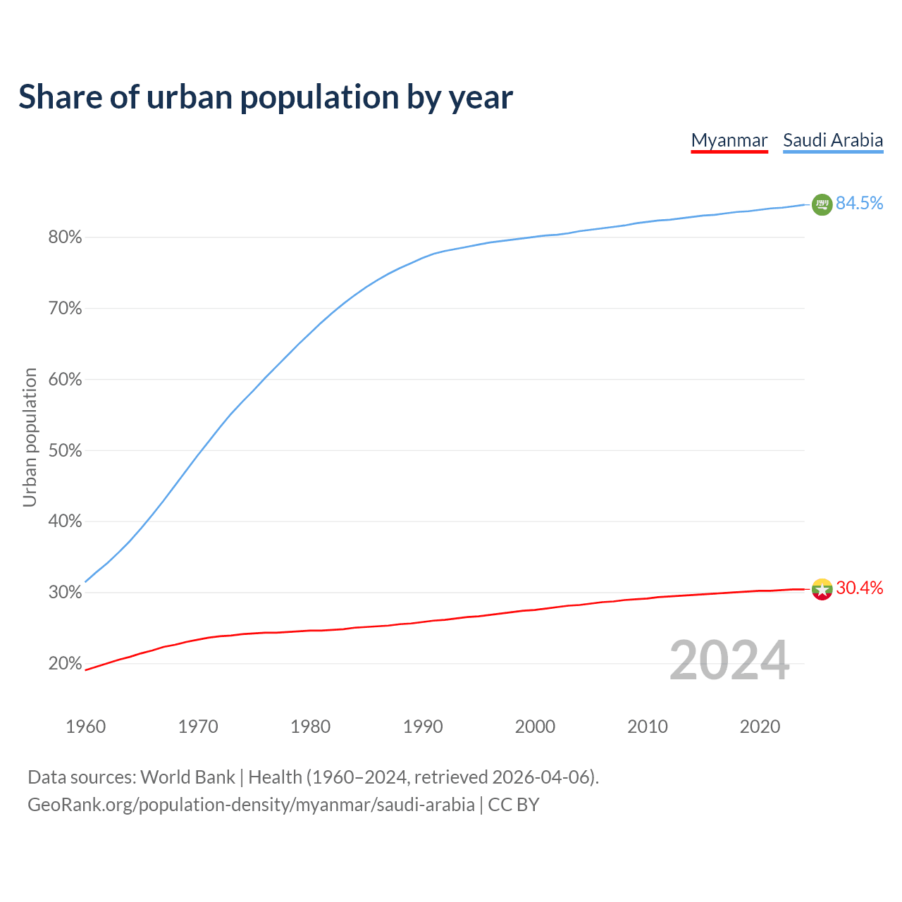 From 2004 to 2024, the share of urban population changed from 28.2% to 30.4% in Myanmar and from 80.8% to 84.5% in Saudi Arabia.
