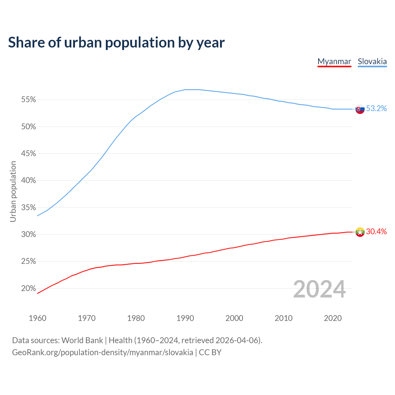 From 2004 to 2024, the share of urban population changed from 28.2% to 30.4% in Myanmar and from 55.6% to 53.2% in Slovakia.