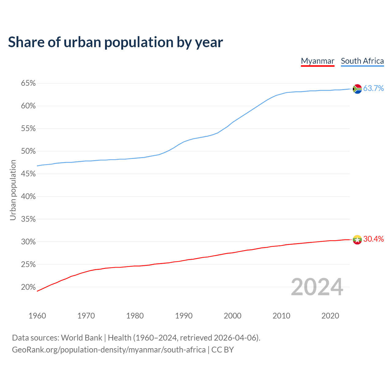 From 2004 to 2024, the share of urban population changed from 28.2% to 30.4% in Myanmar and from 59.1% to 63.7% in South Africa.