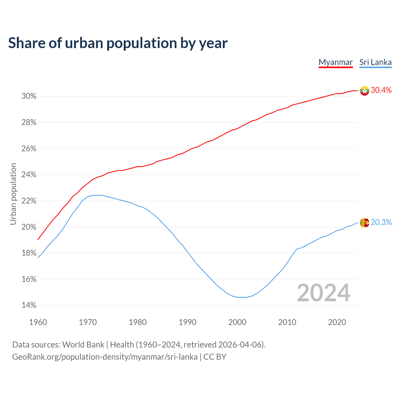 From 2004 to 2024, the share of urban population changed from 28.2% to 30.4% in Myanmar and from 14.9% to 20.3% in Sri Lanka.