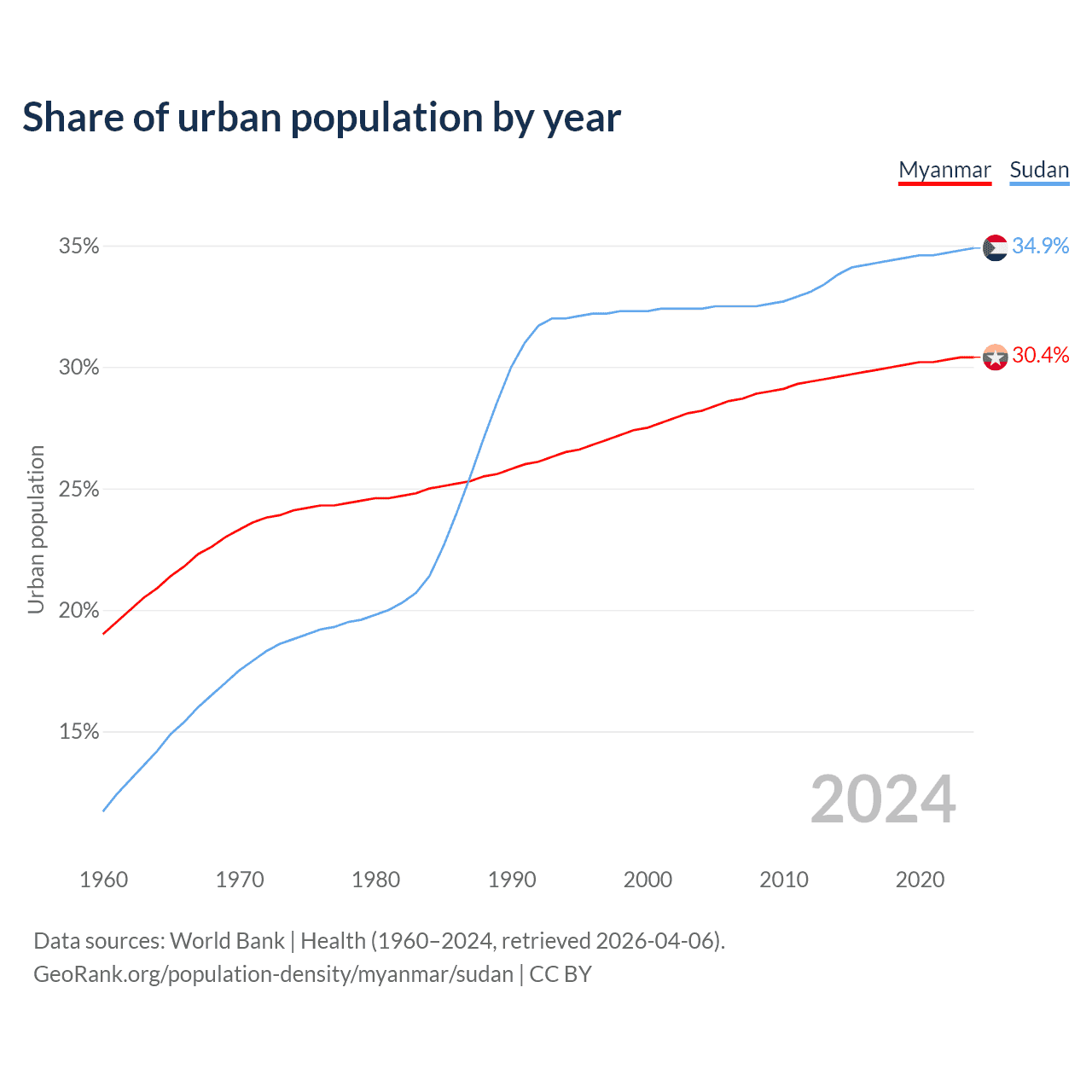 From 2004 to 2024, the share of urban population changed from 28.2% to 30.4% in Myanmar and from 32.4% to 34.9% in Sudan.