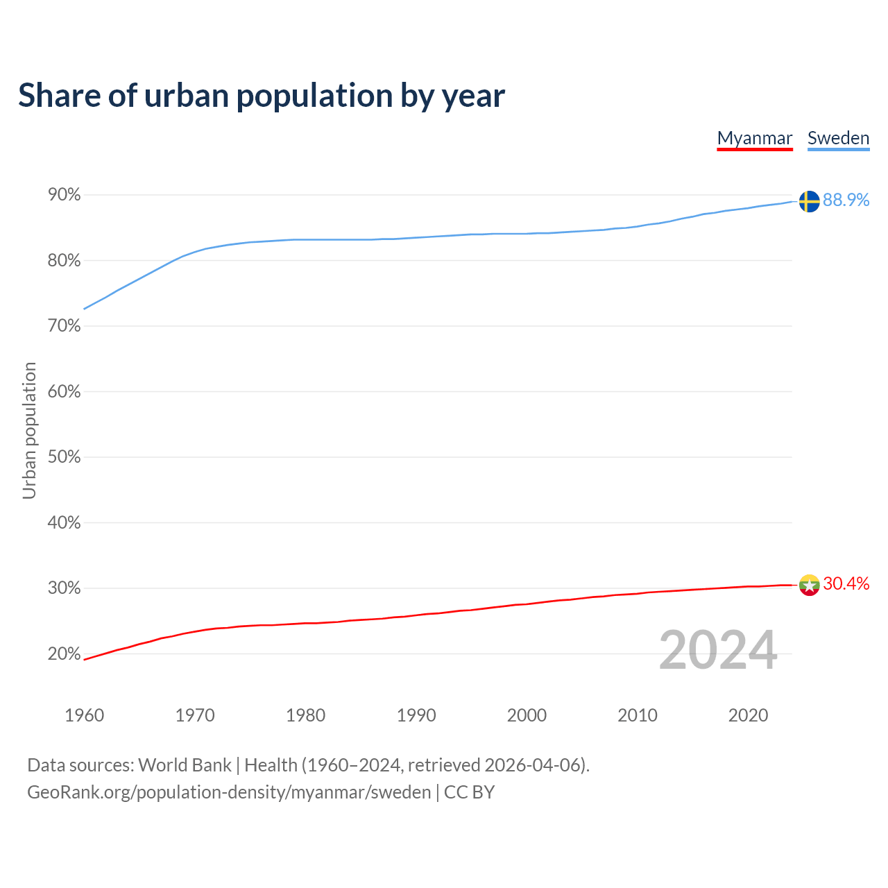 From 2004 to 2024, the share of urban population changed from 28.2% to 30.4% in Myanmar and from 84.3% to 88.9% in Sweden.