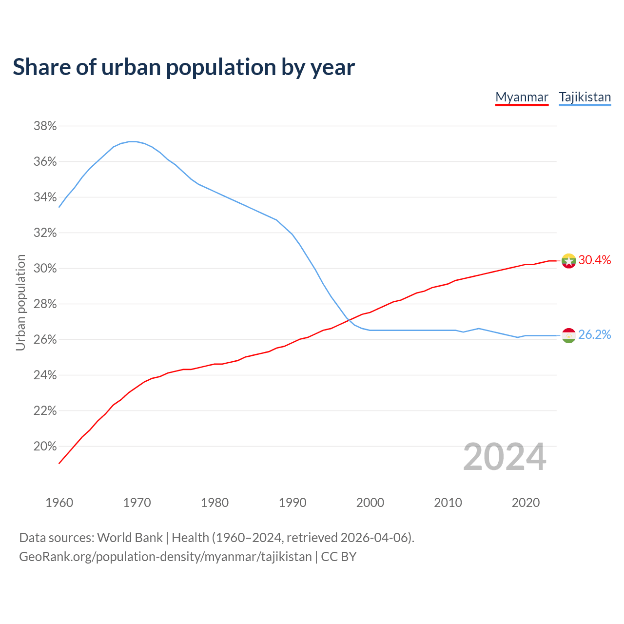 From 2004 to 2024, the share of urban population changed from 28.2% to 30.4% in Myanmar and from 26.5% to 26.2% in Tajikistan.