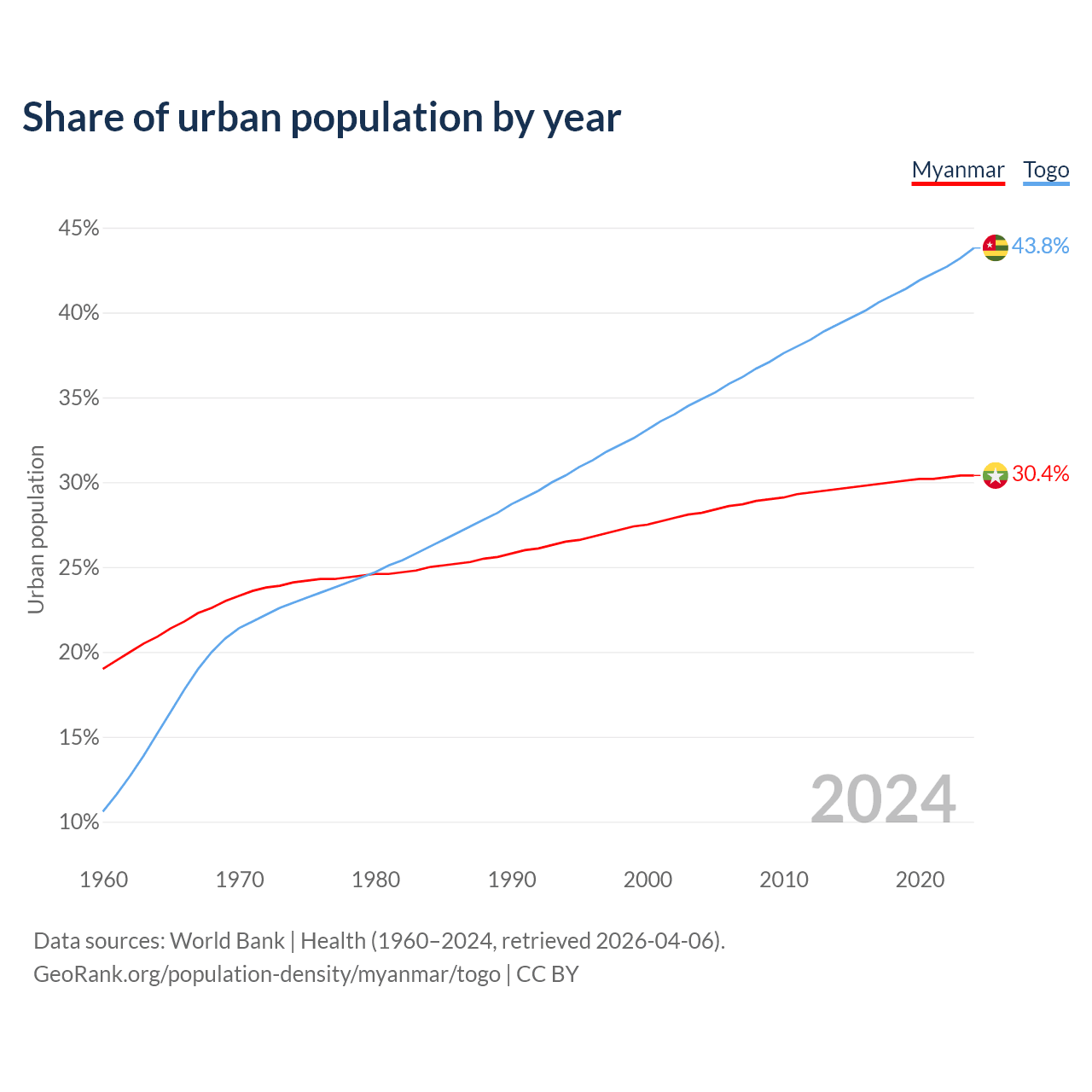 From 2004 to 2024, the share of urban population changed from 28.2% to 30.4% in Myanmar and from 34.9% to 43.8% in Togo.