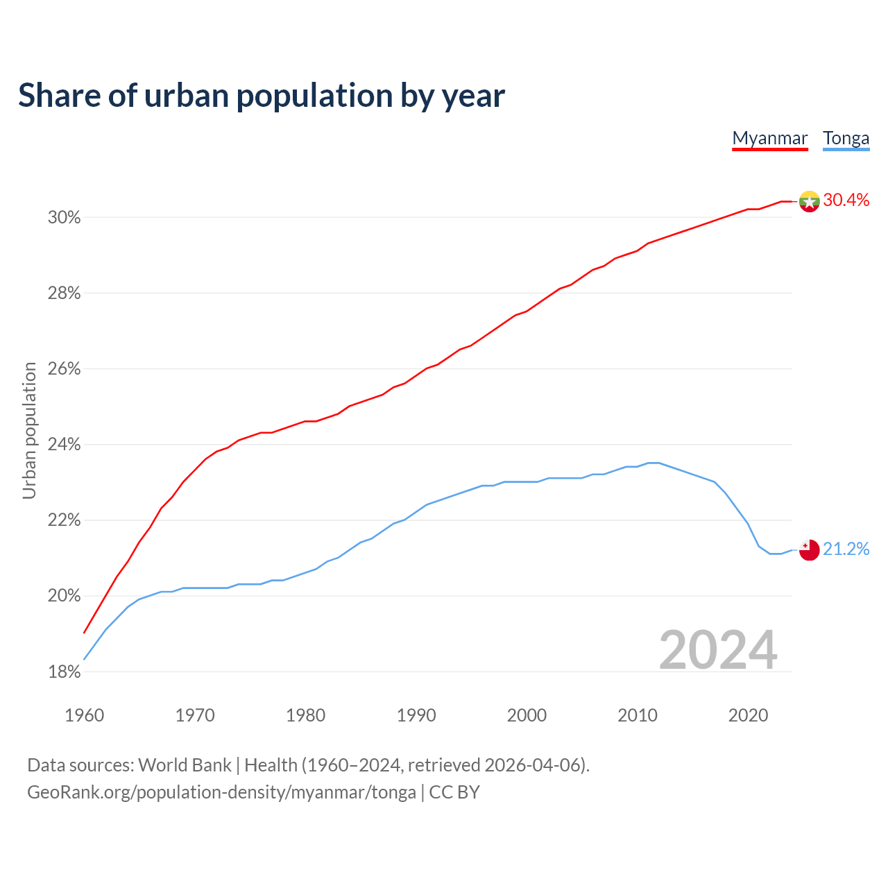 From 2004 to 2024, the share of urban population changed from 28.2% to 30.4% in Myanmar and from 23.1% to 21.2% in Tonga.